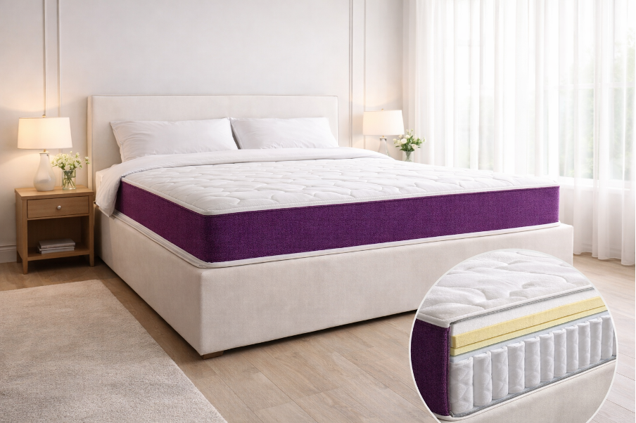 2. Зональные пружины (1024 шт.): Внутри установлен блок независимых пружин. В зоне таза пружины жестче, а под плечами - мягче. Это дает идеальную ровную линию позвоночника в любой позе (на спине или на боку).